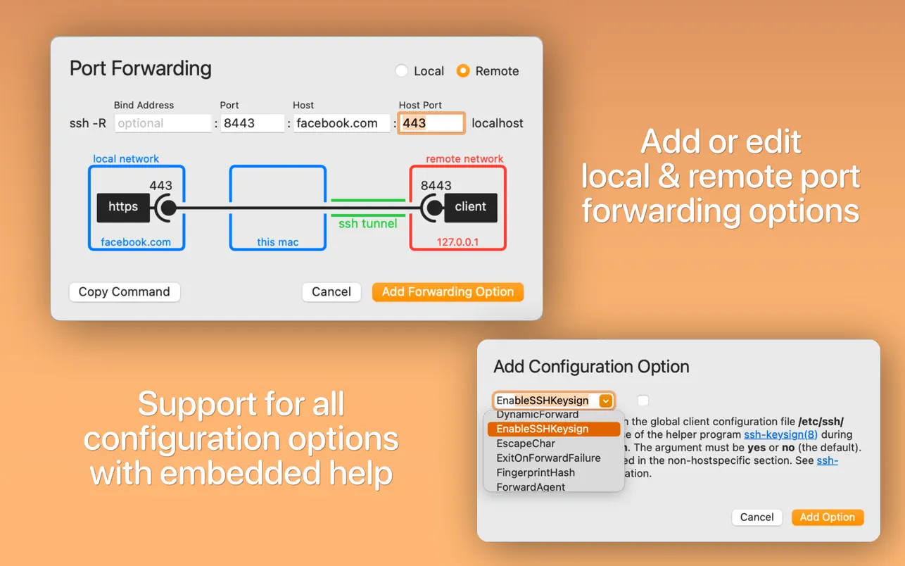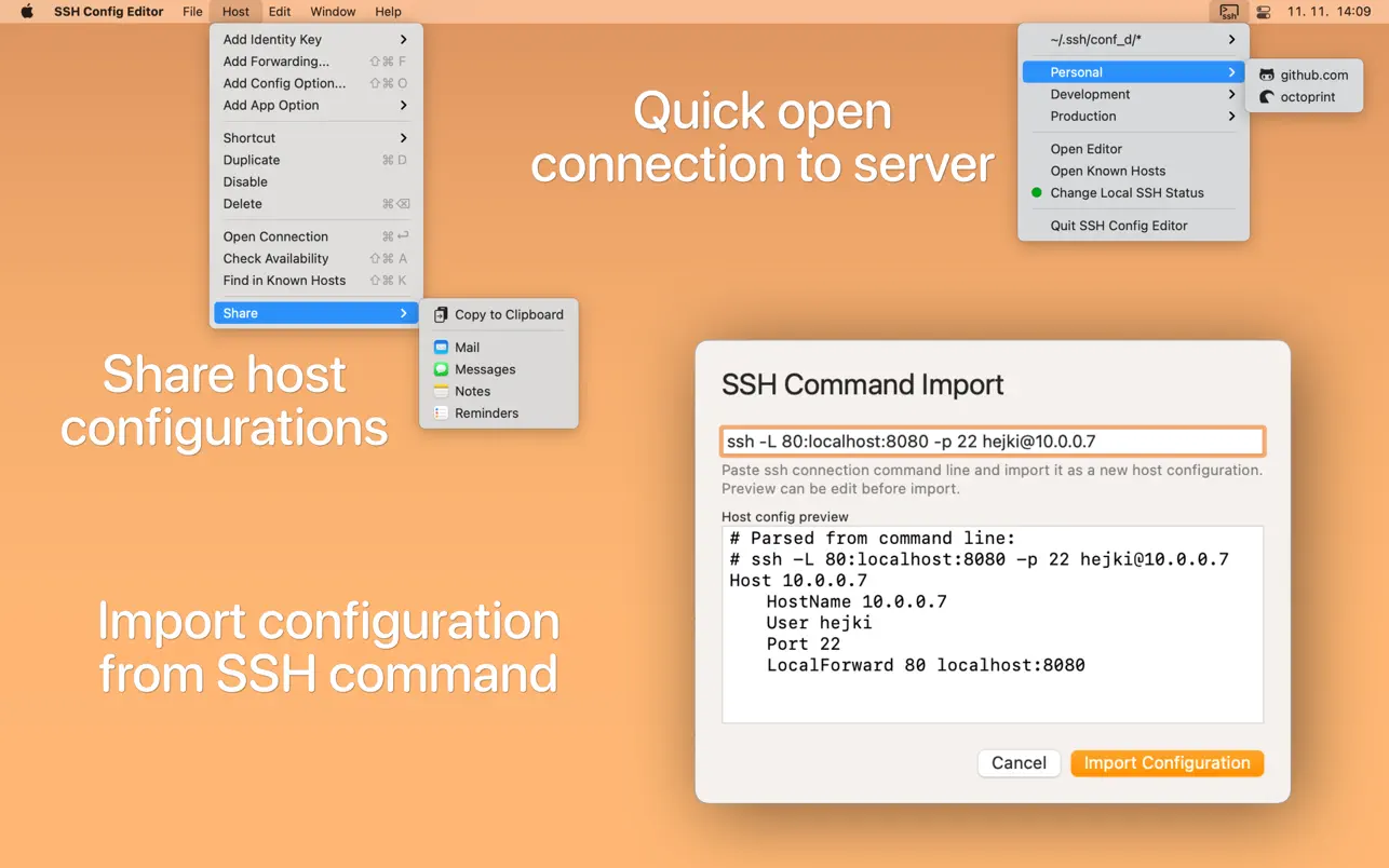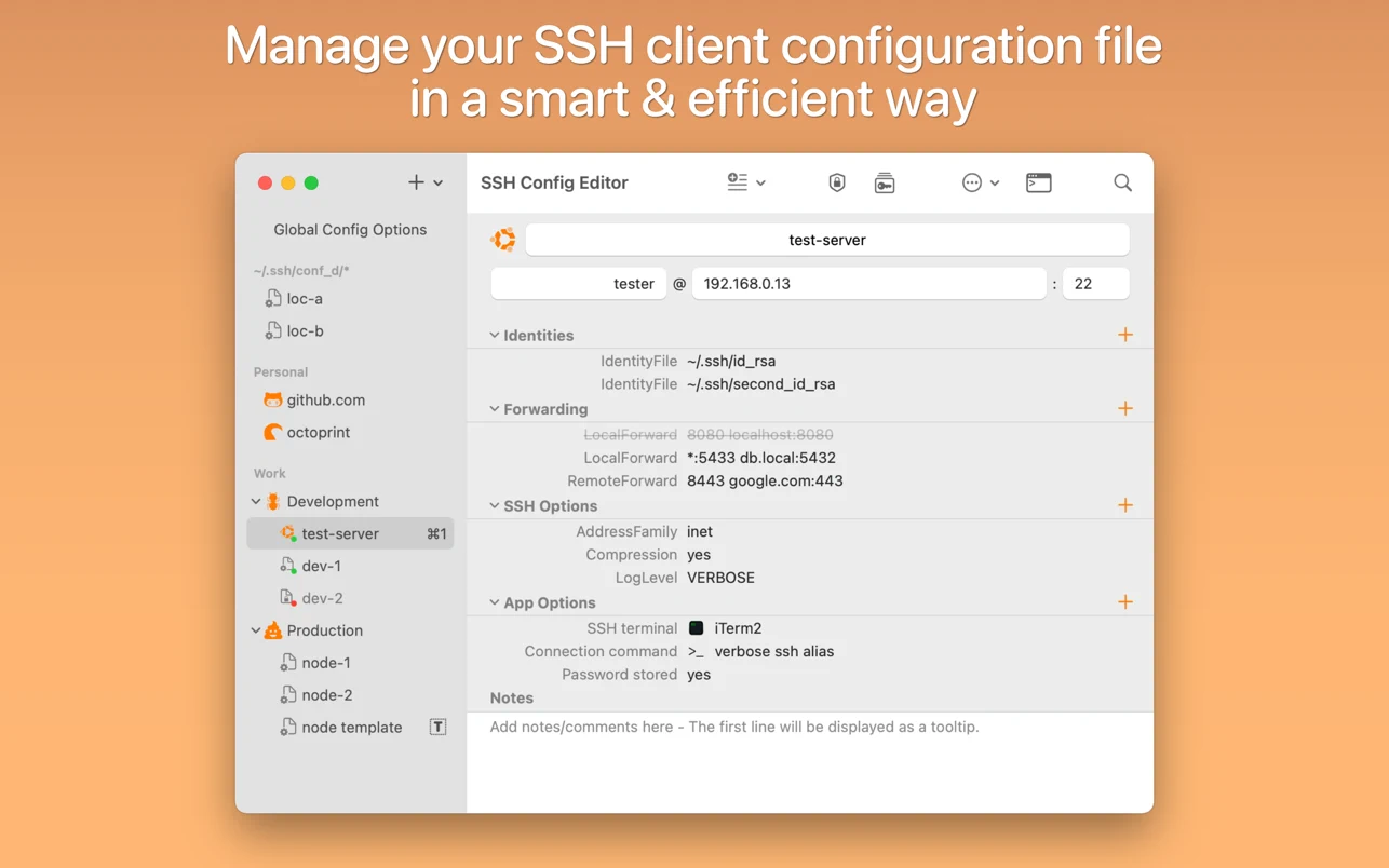 SSH Config Editor Pro for Mac用于管理 OpenSSH ssh 客户端配置文件的便捷工具。您可以添加或编辑身份文件、端口转发(带有图形预览)和任何其他 ssh 配置选项。