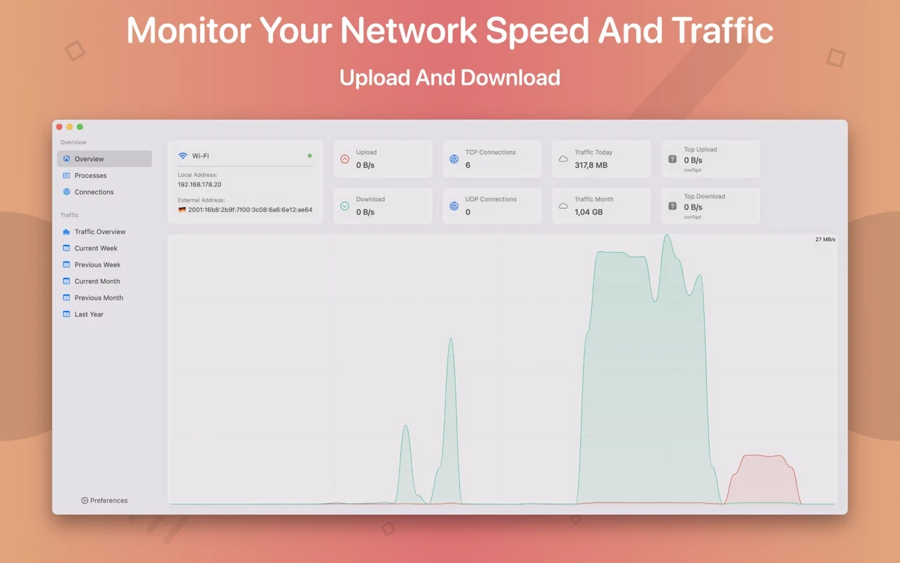 Mac上好用的网速和流量显示工具是哪个?NetWorker for Mac是一款可以在速度和流量两种模式之间切换的网络监测工具,不仅让您在菜单栏上显示当前的网络上传下载速度,同时,您也可以选择不同的网络模式进行监测。