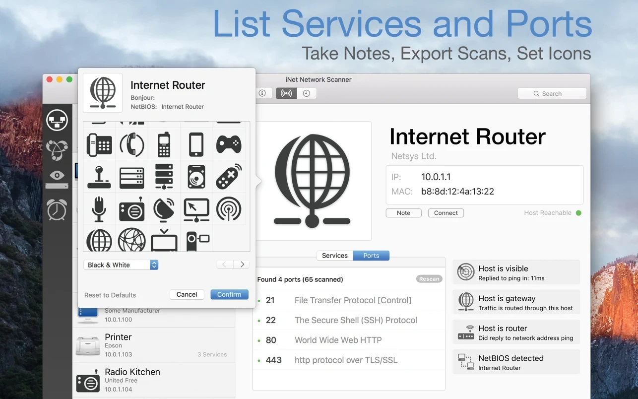 iNet Network Scanner for Mac为您提供有关 Mac 连接到的网络的信息。其非常简单和用户友好的设计使即使是没有经验的用户也可以对网络和正在运行的服务获得深刻且易于理解的概述。iNet 也可通过 iTunes Store 作为 iPhone 和 iPad 应用程序使用。