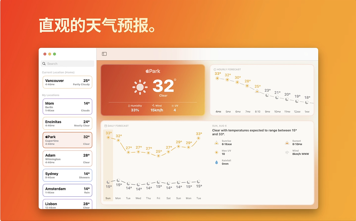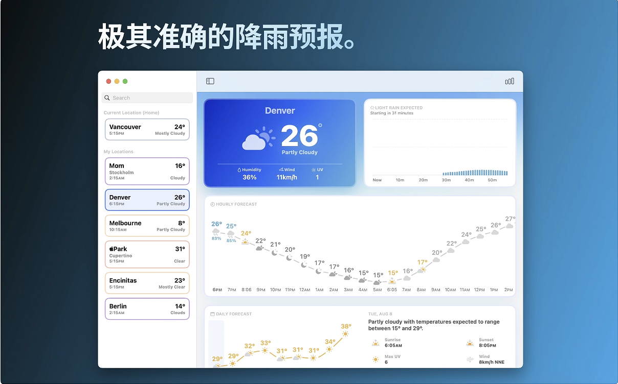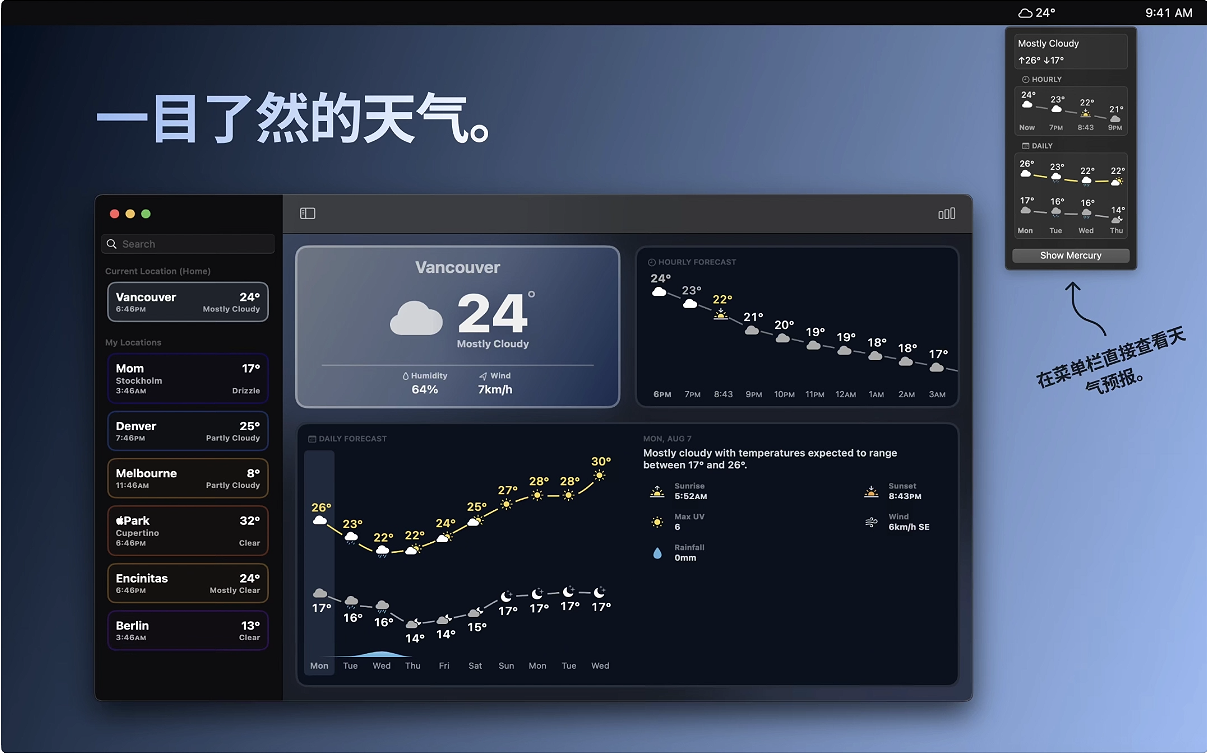 Mercury Weather是一款专为 Apple 全设备打造的天气应用,以极简美观的设计和精准的本地化预报为核心亮点,同时覆盖从基础天气查询到极端天气追踪的多元需求。