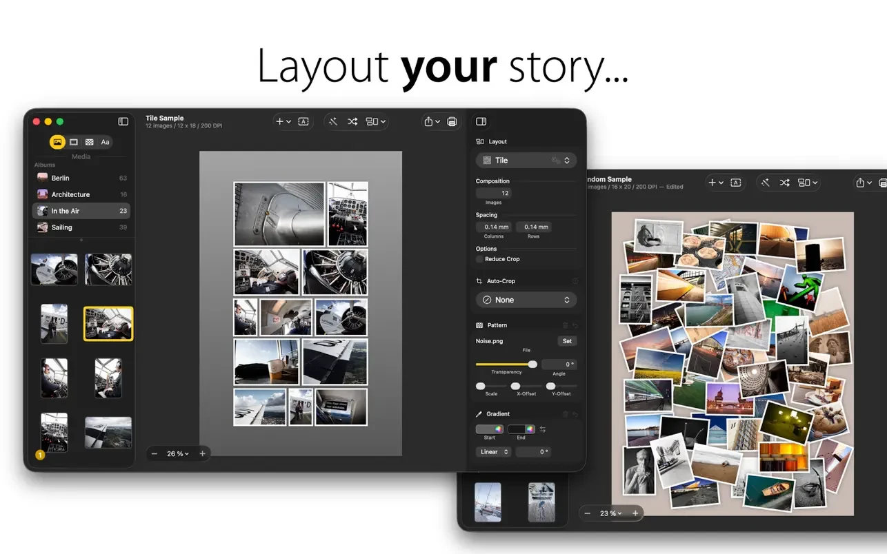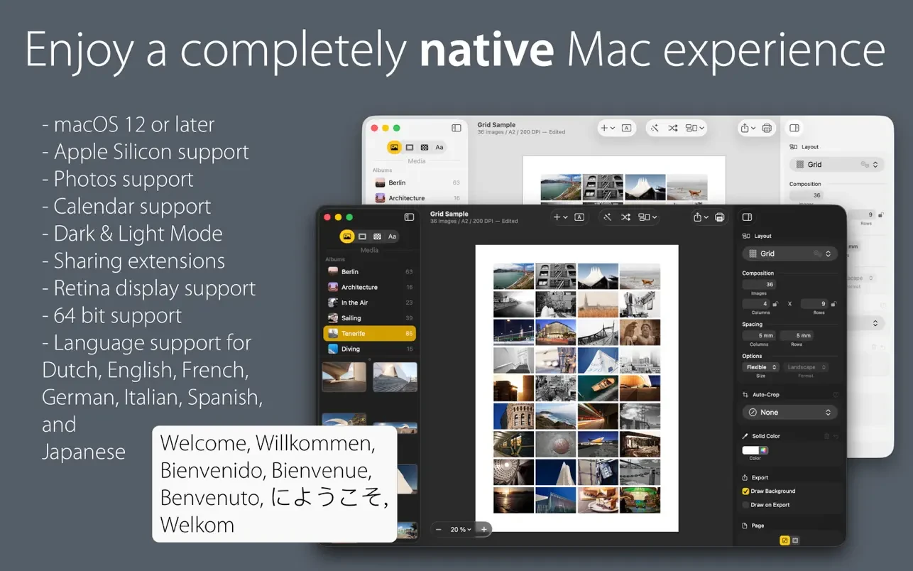 在几分钟内设计拼贴。创新的界面通过具有网格,平铺,圆形和随机布局的各种模板实现了很大程度的定制。根据自己的喜好调整相框,滤镜和背景。结果是可以打印和显示精美的拼贴画。